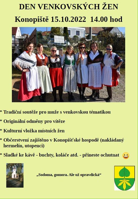 Dne 15.10.2022 se v Konopišti konal oblíbený Den venkovských žen. Na programu byly veselé, netradiční soutěže pro muže: např. házení vidlemi, jízda s kolečkem, věšení dámského spodního prádla na šňůru aj. Po vyhlášení vítězů jednotlivých kategorií se soutěžní odpoledne ukončilo malou kulturní vložkou místních žen.